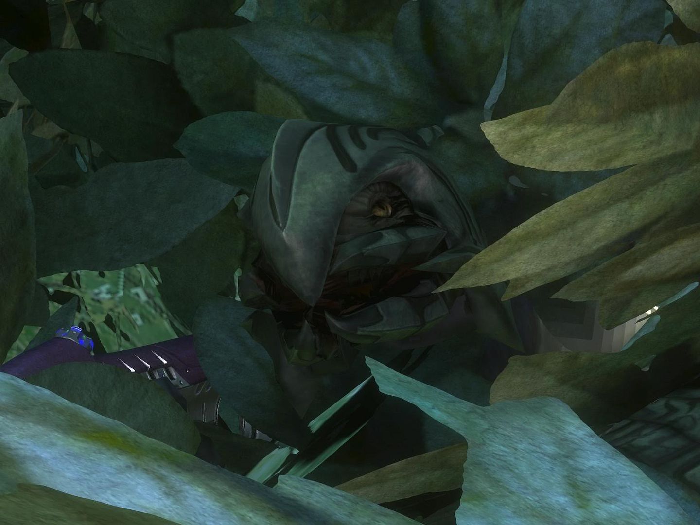 his helmet kind of looks like a leaf here… i think i still see the carbine? or a purple twig